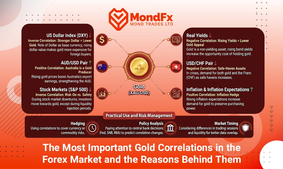 The positive correlation between gold and AUD/USD is largely rooted in the commodity driven nature of the Australian economy and its dependence on global raw material markets, while the inverse relationship between gold and USD/CHF mainly reflects investor behavior during periods of heightened systemic risk and a shift toward safe haven assets. However, these relationships are not always fixed or stable and may weaken or change direction under the influence of central bank monetary policies, geopolitical crises, sudden shifts in market sentiment, and even differences in trading hours. Therefore, the professional use of gold’s correlation with AUD/USD and USD/CHF requires a dynamic perspective, multidimensional analysis, and avoidance of absolute reliance on historical patterns an approach that ultimately leads to better risk management, fewer trading surprises, and more informed decision making in the Forex market.