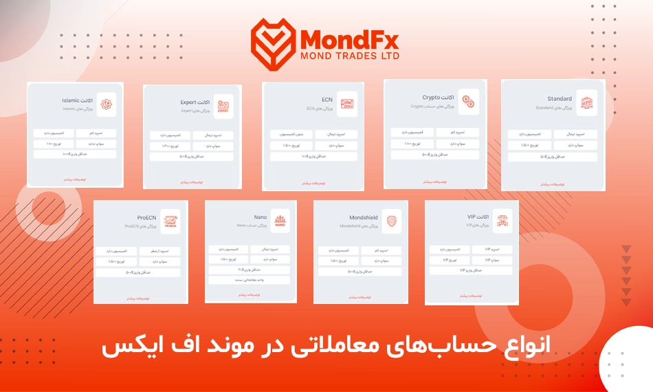 موند اف ایکس با هدف پوشش نیازهای مختلف معاملهگران، 9 حساب معاملاتی متنوع ارائه میکند تا هر کاربر بتواند بر اساس استراتژی و سبک معاملاتی خود بهترین گزینه را انتخاب کند. هر حساب با شرایط ویژه طراحی شده و امکانات متفاوتی ارائه میدهد: