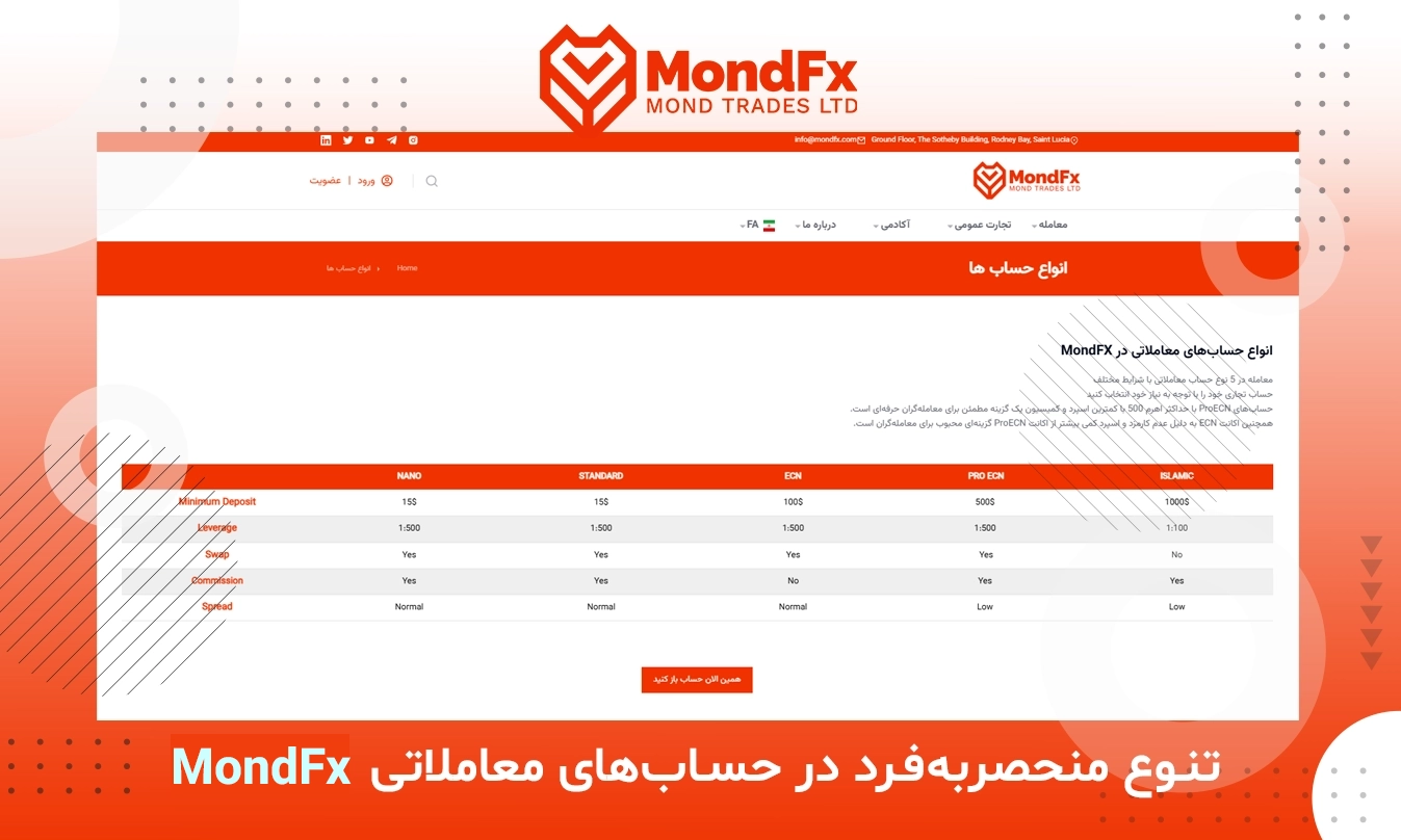 موند اف ایکس با ارائه انواع حسابهای معاملاتی از جمله نانو، استاندارد، ECN ،Pro ECN واسلامی انتخابهای گستردهای را در اختیار کاربران خود قرار میدهد.