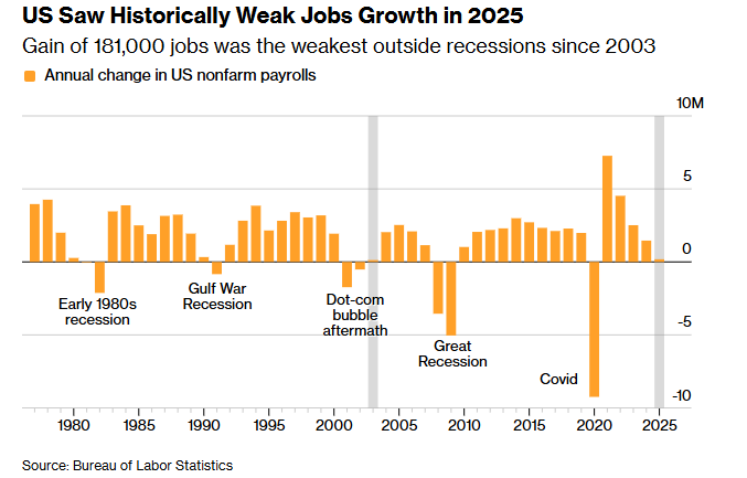 با وجود شروع قدرتمند ۲۰۲۶، بازبینی نزولی گسترده آمار ۲۰۲۵ تصویر متفاوتی ارائه میدهد. در کل سال ۲۰۲۵ تنها ۱۸۰ هزار شغل ایجاد شد؛ ضعیفترین عملکرد از سال ۲۰۰۳.