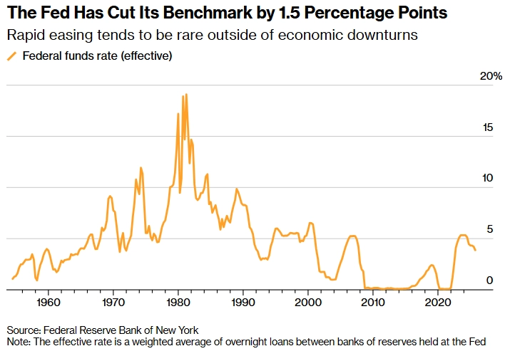 فدرال رزرو نرخ بهره را از اوج، با سریعترین سرعت از دهه ۸۰ درصد کاهش داده و دویچهبانک هشدار میدهد که شتاب کاهش نرخ در حالی که اقتصاد در رکود نیست، ممکن است فشار تورمی را تشدید کند. سیاستهای مالی بهشدت تسهیل شدهاند، بازار سهام در اوج نوسان میکند و رشد اقتصادی هنوز قابلقبول است.