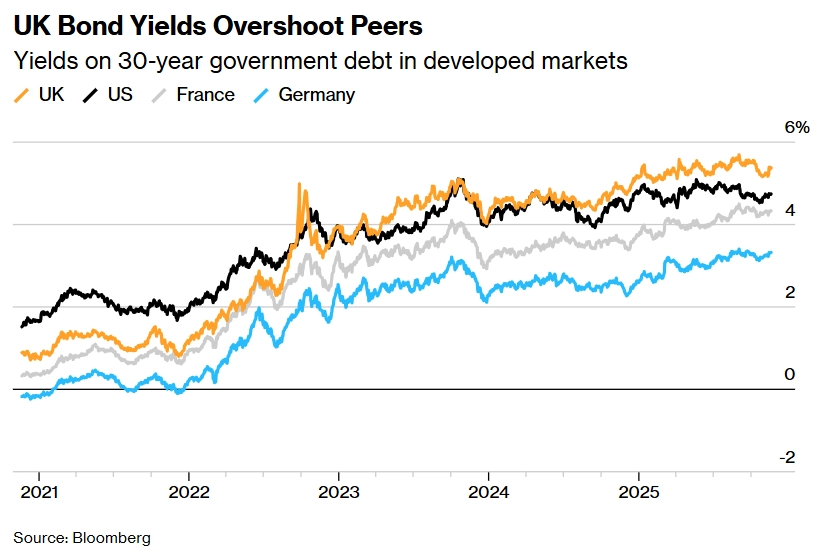 سال مالی گذشته، هزینه تامین مالی دولت ۱۰۶ میلیارد پوند بوده که بسیار بیشتر از ۴۰ میلیارد پوند پیش از دوره کرونا است؛ این افزایش شدید بهدلیل تورم بالای انگلستان و افزایش نرخهای بهره بوده است. تصویر زیر نشان میدهد که بازدهی اوراق دولتی ۳۰ ساله انگلستان بسیار بالاتر از سایر بازارهای توسعهیافته است؛ این موضوع از تورم بالاتر انگلستان نسبت به رقبا نشأت میگیرد. به دلیل تبعات برگزیت، بهرهوری ضعیف و برخی رویههای ساختاری در قیمت انرژی، تورم انگلستان پس از کرونا شدیدتر از سایر رقبا بوده است.