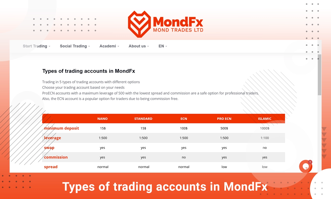 MondFX provides multiple account types to suit different trading needs:Nano Account:Minimum deposit of $15, low spreads, and competitive commissions.