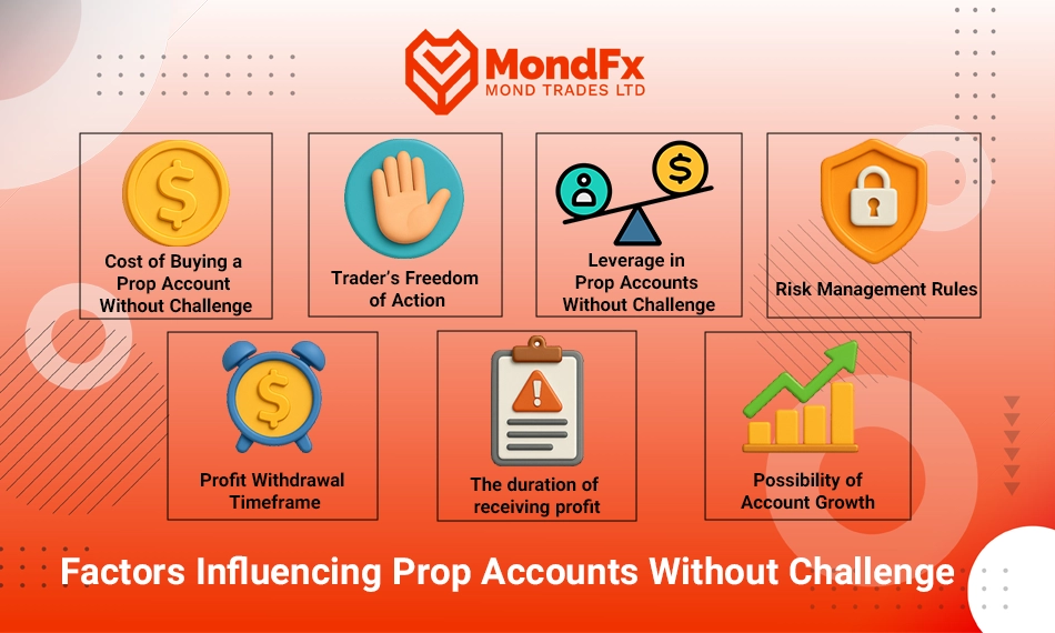 The success of an active trader in prop firms is not limited to just receiving capital; many factors influence the quality of the firms and the accounts themselves, affecting traders' chances of success and profitability. Understanding these factors helps traders gain a better understanding of their work environment, make better decisions when choosing a prop firm, and identify hidden risks in prop activities. Some of the most important factors influencing prop accounts without challenge include the following.